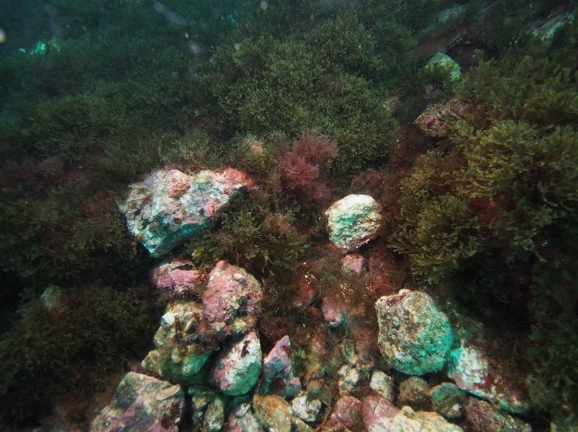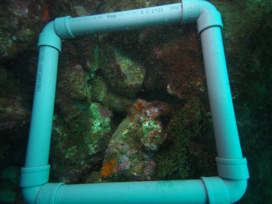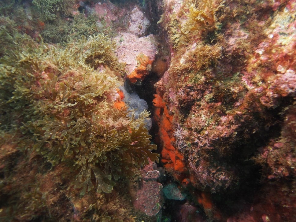 1 – Arrecifes colonizados por macrófitos infralitorales entre 8 y 25 metros de profundidad máxima. Las facies o asociaciones características son las formadas con las especies: Halopteris filicina; Sphaeroccocus coronopifolius; Padina pavonica; Bonnemaisonia clavata; Rugulopterix okamurae. Ahora esta última especie lo domina todo y ha desplazado a las demás especies. En las zonas más oscuras era típico encontrar ejemplares de Payssonnelia squamaria, Platoma cyclocolpum, Predaea ollivieri; Palmophyllum crassum y Halychrisis depressa.